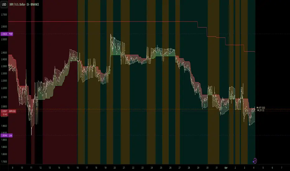 Users can enable visual highlights when LTF and/or HTF trends extend beyond 13 bars. These show as faint red, yellow, or teal backgrounds depending on which trends persist — a soft but powerful signal of trend maturity or compression.