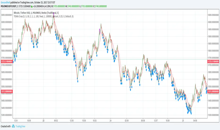 Since it's so easy to identify trends on a Renko plot, this strategy uses a simple moving average cross idea. Instead of an EMA, we use a TEMA (triple exponential moving average) because that version does not lag as much.