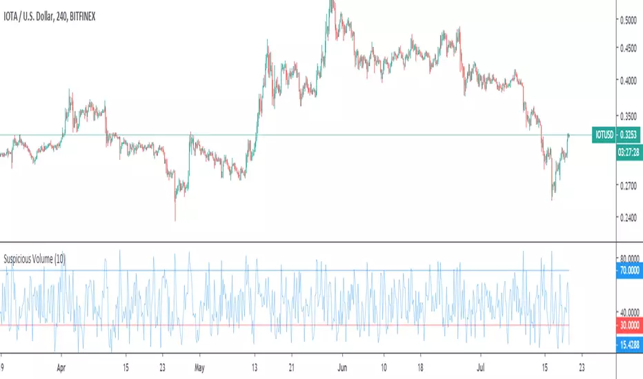 this script can use for detecting the suspicious volume. In this indicator the ratio of the current volume to the average of several previous candlesticks has been defined as standardized between 0 and 100. So when this indicator go to 100 we can understand that trading volume is increasing and vice versa.
