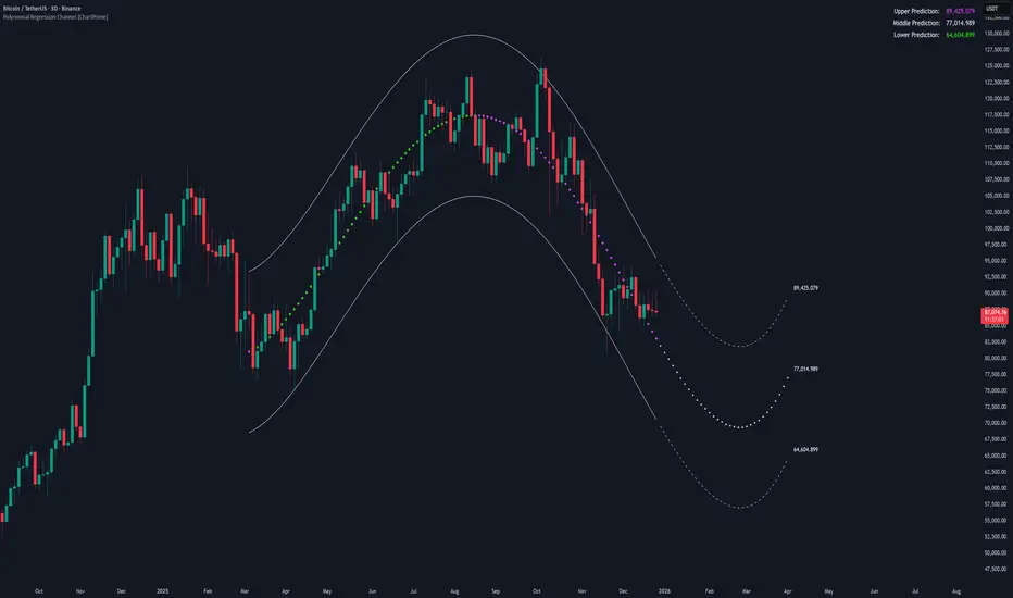 The Polynomial Regression Channel [ChartPrime] fits price action using advanced polynomial regression, extending beyond simple linear or logarithmic models. By leveraging matrix calculations, it builds a curved regression line that adapts to swings more naturally. The channel includes extrapolated forward projections, helping traders visualize where price may gravitate in the near future. Midline color shifts reflect directional bias, while prediction ranges are marked with dashed extensions, labeled prices, and a live table for clarity.