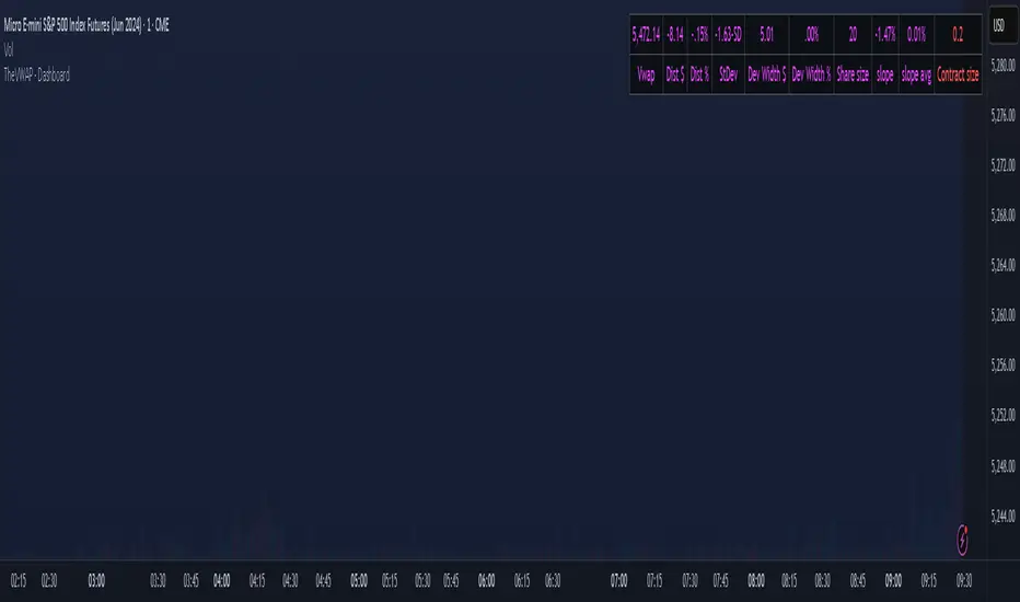 Appearing in the upper right corner of the chart by default, Dashboard allows traders to quickly assess a chart’s specific volatility in the context of — and its position relative to — the day's volume-weighted average price.