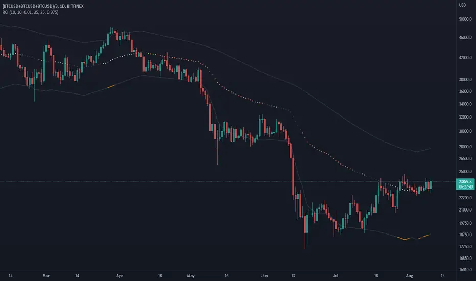 This is a regression channel that uses ichimoku to determine trend. The sensitivity is customizable. The centerline will change color according to the trend detected by ichimoku, and each line can act as support/resistance. The bands of the channel also change colors according to how far price is getting away from them. If you notice in this example, the lower band is turning orange when the price is getting too far away from it, suggesting that it may have risen too fast and too soon. This is still in testing so feel free to comment with any suggestions or fixes.