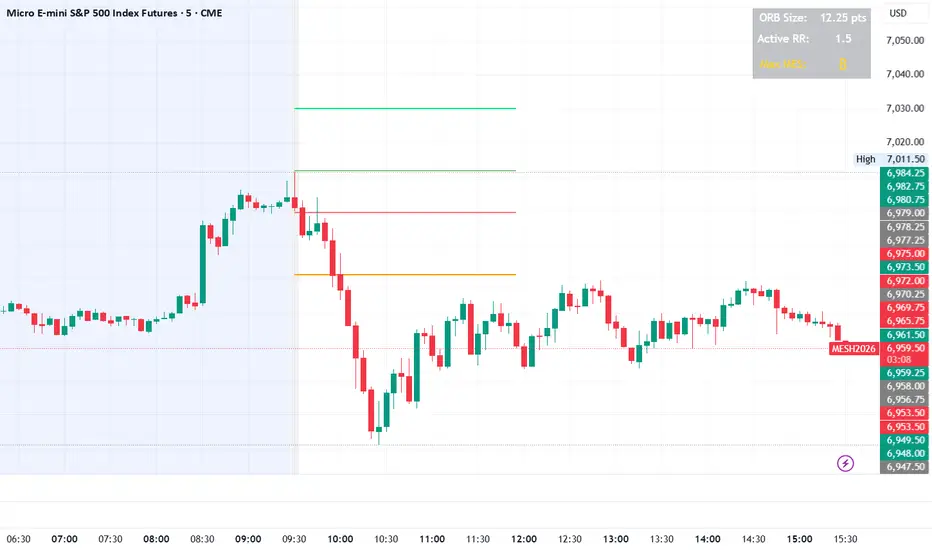 This script is based off of the 5 minute high and low (opening range) of the NY session, specifically developed for ES/MES. It marks the high and low of the first five minutes of trading, as well as marks profit targets if price breaks out high or low.