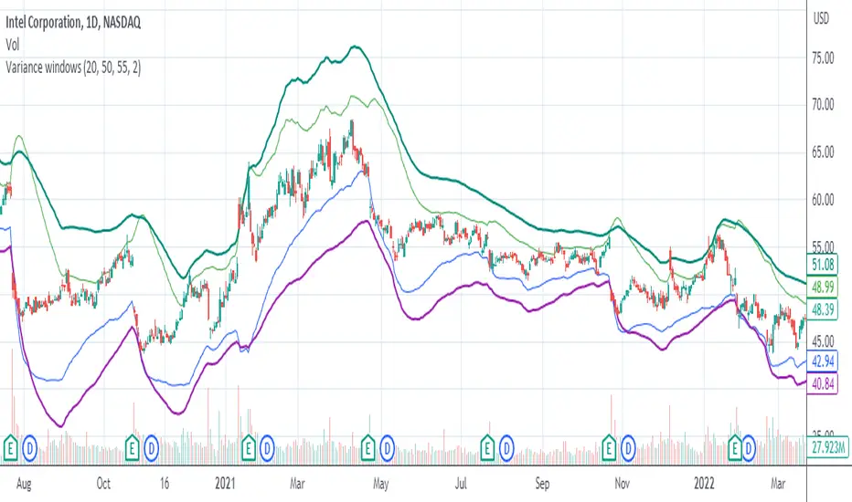 Just a quick trial at using statistical variance/standard deviation as an indicator. The general idea is that higher variance in the short term tends to indicate more volatility/movement. The other thing is that it can help set probabilistic boundaries for movements (e.g., if you set the bars to be 2 standard deviations, you are visualizing a range that denotes a 95% probability window).