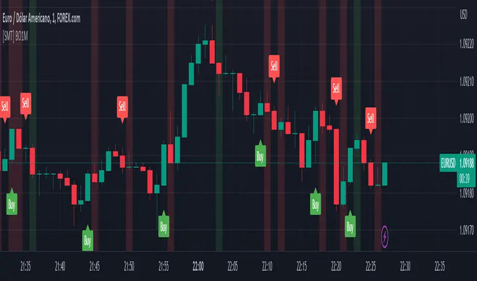 This indicator called "[SMT] Binary Option 1 Minute" is designed to trade binary options on 1-minute time frames. It is based on two moving averages and a crossover signal. The moving averages used are calculated from the average prices of the last time periods. The first moving average is calculated with a shorter period, while the second is calculated with a longer period.