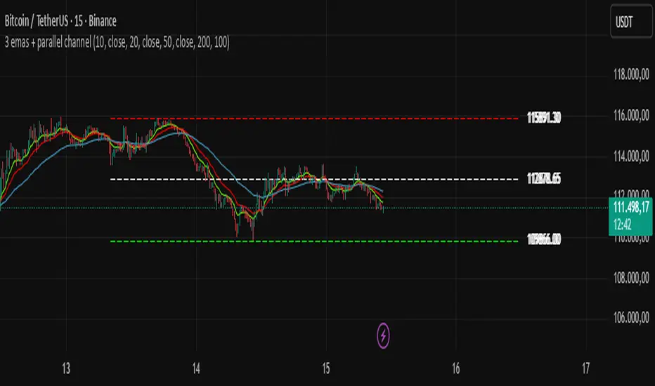 It is an indicator designed for scalping, it has 3 configurable emas, which by default come the EMA of 10, 20 and 50 periods, it also draws a parallel channel of the last 200 candles of the graph.