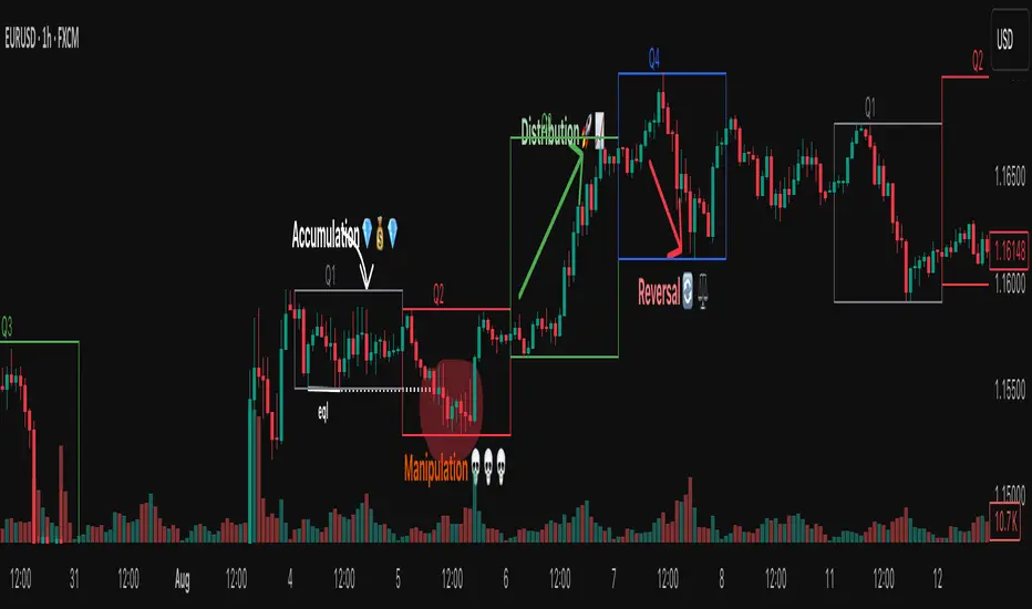 ⭐ An important feature of this indicator is the Fibonacci levels, which are calculated in a clever way on the Q1 part of each cycle. You can use this levels for precise entries on manipulation in Q2