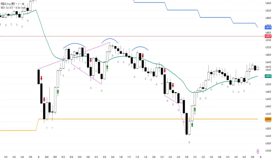 Plots EMA20 for current TF, 1H, and Daily, plus a 5-minute bar counter starting from 09:30 NY time, showing every Nth bar (default 2).