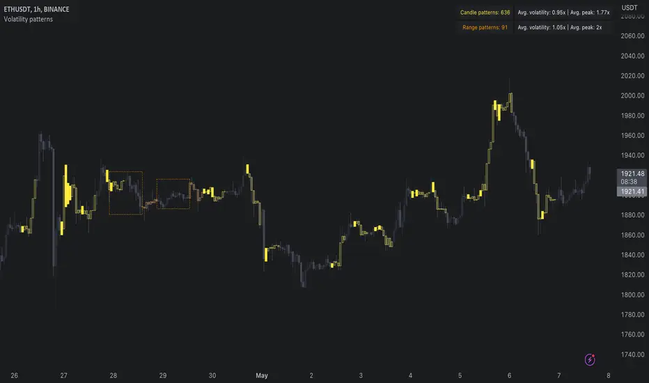 Volatility patterns detect various forms of indecisive price action, on a larger scale as a compressed range and on a smaller scale as indecision candles. Indecisive and volatility suppressing price action can be thought of as a spring being pressed down. The more suppression, the more tension is built and eventually released as a spike or series of spikes in volatility. Each volatility pattern is assigned an influence period, during which average and peak relative volatility is recorded and stored to volatility metrics.