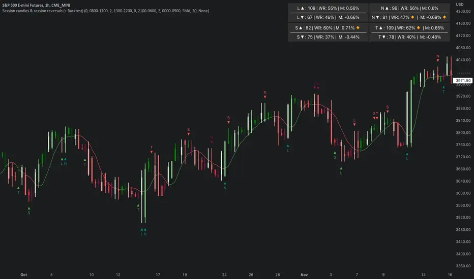 Like traditional candles, session based candles are a visualization of open, high, low and close values, but based on session time periods instead of typical timeframes such as daily or weekly. Session candles are formed by fetching price at session start (open), highest price during session (high), lowest price during session (low) and price at session end (close). On top of candles, session based moving average is formed and session reversals detected. Session reversals are also backtested, using win rate and magnitude metrics to better understand what to expect from session reversals and which ones have historically performed the best.