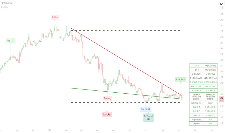 Not all markets trend; many cycle between periods of accumulation (buying pressure building up), distribution (selling pressure dominating) and neutral behavior. This module classifies the current bar into one of these phases without using ATR, relying solely on buyer and seller volume statistics. It looks at net flows, ratio changes and an OBV‑like cumulative line with dual‑reference (1‑ and 2‑bar) trends. The result is displayed both as on‑chart labels and in a dedicated row of the info table.