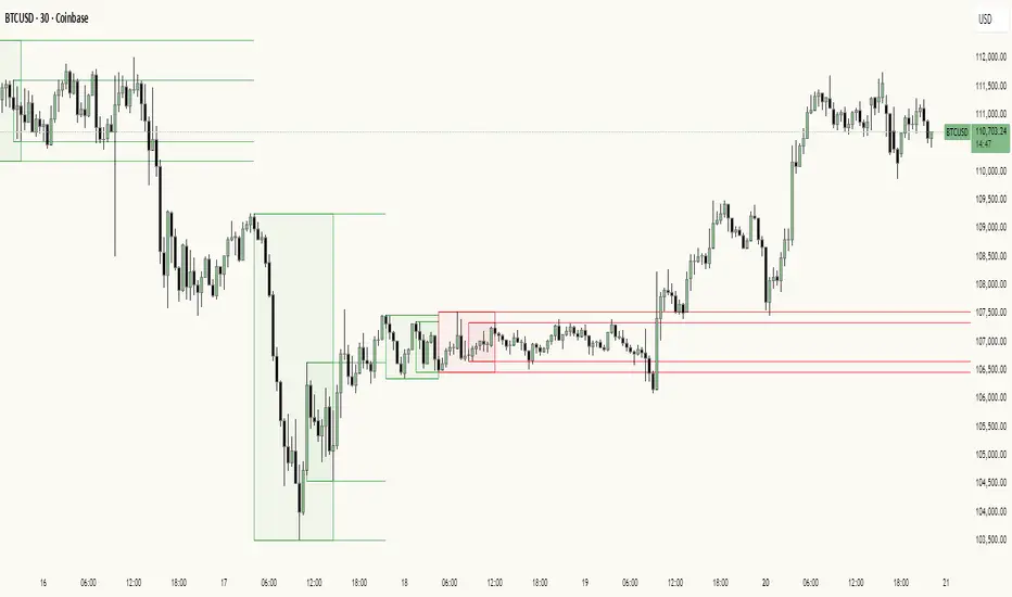 The Inside Swings indicator identifies and visualizes "inside swing" patterns in price action. These patterns occur when price creates a series of pivots that form overlapping ranges, indicating potential consolidation or reversal zones.
