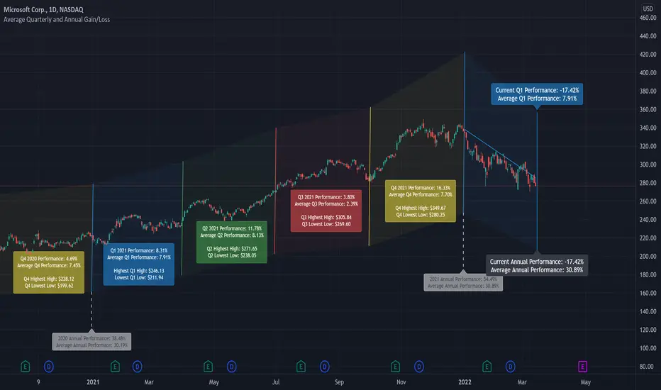 The average percentage gain/loss for Q1, Q2, Q3, and Q4 are calculated and displayed on the chart; colors are adjustable.