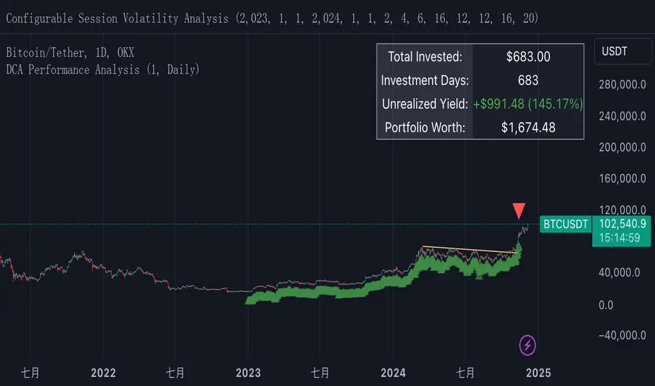 This indicator helps you analyze the performance of a DCA investment strategy by simulating regular periodic investments into an asset. Perfect for long-term investors who want to evaluate or backtest their DCA strategy.