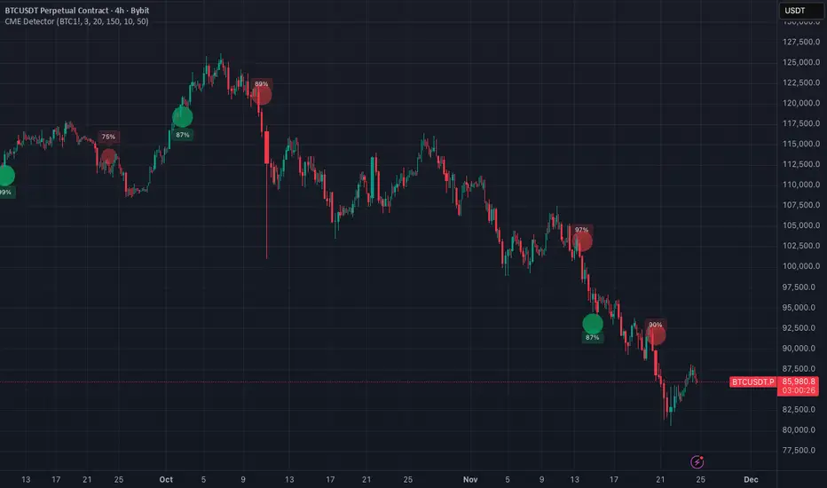 The indicator's entire foundation rests on confirming that specific conditions are met on two datasets at the same time: (1) The user's current chart (e.g., BYBIT:BTCUSDT) and (2) The CME Bitcoin Futures chart (CME:BTC1!).