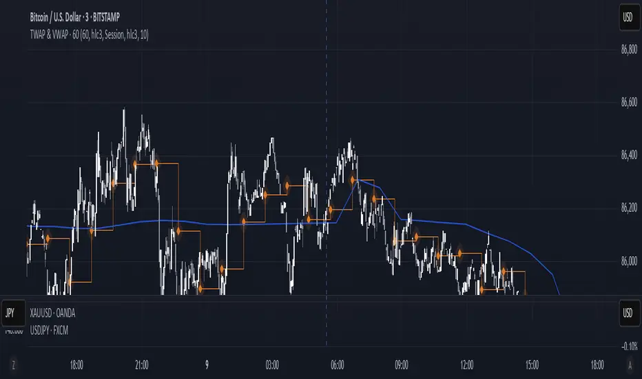 This script integrates Time Weighted Average Price (TWAP) and Volume Weighted Average Price (VWAP) into a single TradingView indicator, allowing traders to analyze both price-weighted and volume-weighted trends simultaneously.