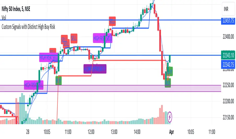 High-Risk Buy Signal: Similar to the regular buy signal, but it specifically targets scenarios where Candle 1's high is exactly on the 5 EMA. Candle 2 must either have a higher high than Candle 1 or touch the 5 EMA, and it must close higher than its opening price. This signal indicates a potential for an upward trend continuation but is considered higher risk due to the price's proximity to the 5 EMA.