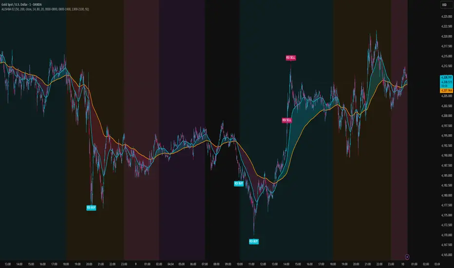 The "ALISHBA 02" indicator is a multi-tool dashboard for technical analysis. It combines a long-term trend filter (200 EMA), a medium-term trend filter (50 EMA), momentum analysis (RSI), and geographic session timing to provide a holistic view of market conditions directly on the price chart.