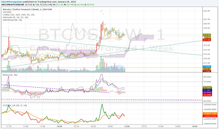 Overlay shows difference between OBV and OBV's moving average as green and red dos above and below cendles.