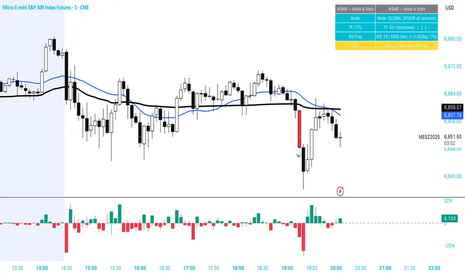WSMR v3.9 is a complete impulse → exhaustion → mean‑reversion framework designed for systematic intraday trading. It identifies high‑energy displacement events (“WhaleSplashes”), measures volatility structure, tracks VWAP deviation, and confirms reversals using RSI divergence, Z‑Score resets, SMA20 reclaim, and pivot-based structure.