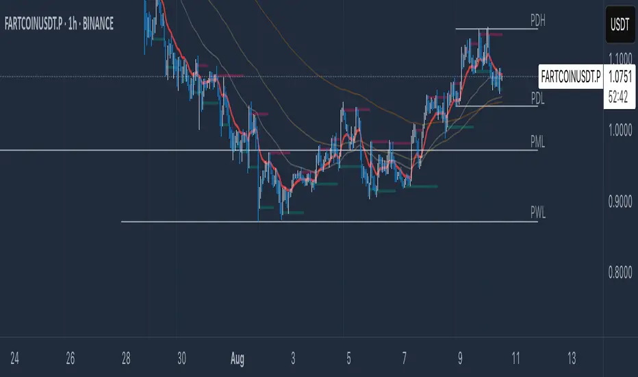 - EMAs 8 & 21 are used internally to color the line; they’re not plotted, keeping the chart clean.
