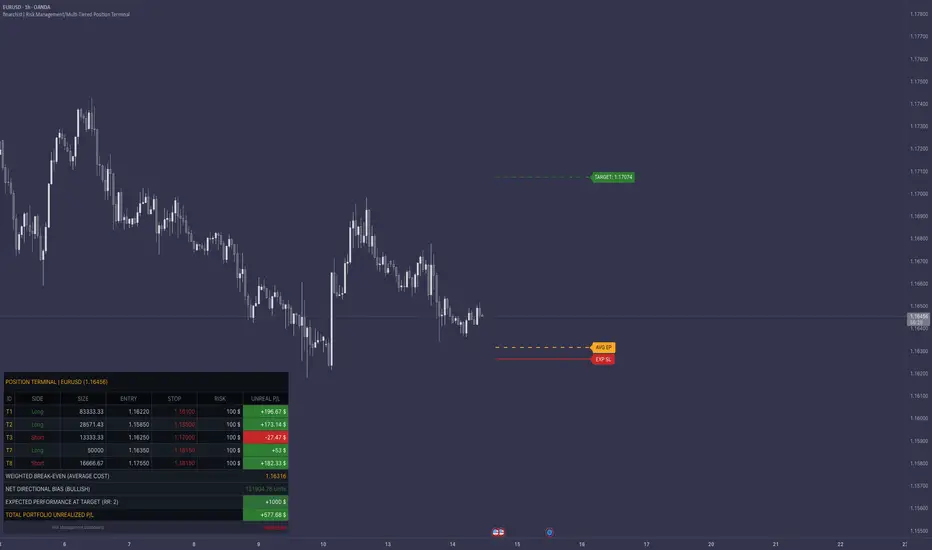 This script, titled "finarchist | Risk Management/Multi-Tiered Terminal," is a professional-grade trading dashboard designed to transform how you manage complex trade entries. Unlike standard calculators, this terminal acts as a "mission control" for multi-tier positions, allowing you to scale into trades while maintaining absolute control over your risk.