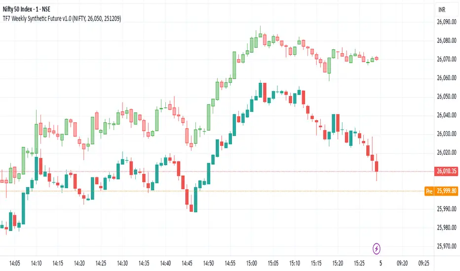 This indicator plots a Synthetic Future Chart by combining the ATM (At-The-Money) Call and Put option prices for NIFTY or SENSEX indices.
