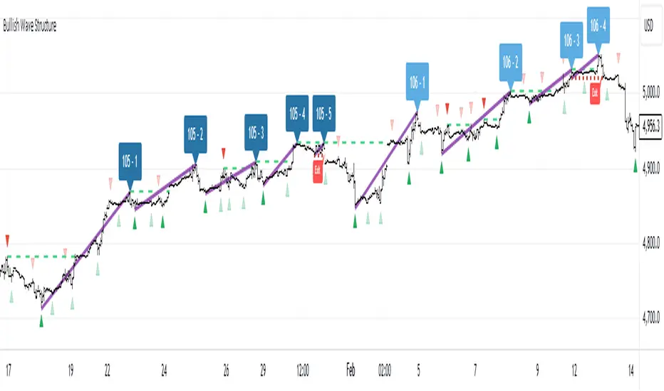 This indicator visualizes bullish waves and the uptrend structure. It highlights the wave patterns, breakout levels, and swing highs and lows, distinguishing major and minor swings. The script also incorporates labels to denote trend and wave numbers, enhancing clarity in trend and wave identification. The waves plotted on the chart aid in chart study, trend analysis, and decision-making. Drawing objects on the chart are customizable.