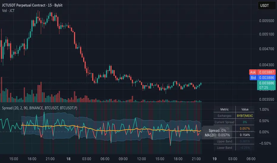 A comprehensive indicator that automatically calculates and visualizes the percentage spread between spot and perpetual futures prices across multiple exchanges.
