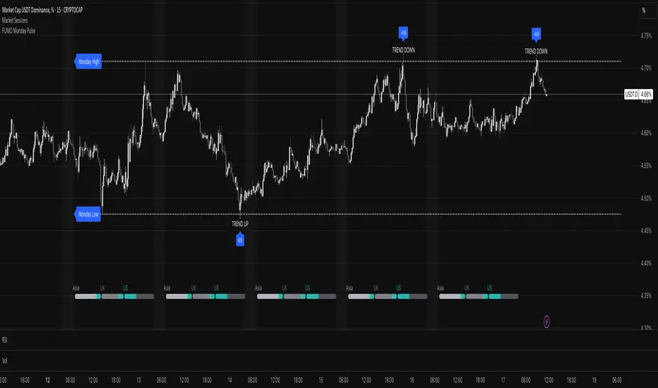 FUMO Monday Pulse is a directional trading strategy designed to detect early-week momentum and breakout structure, based on Monday’s high and low levels. This tool combines smart breakout detection, retests, and volume filters — ideal for traders looking to systematize early trend entries.