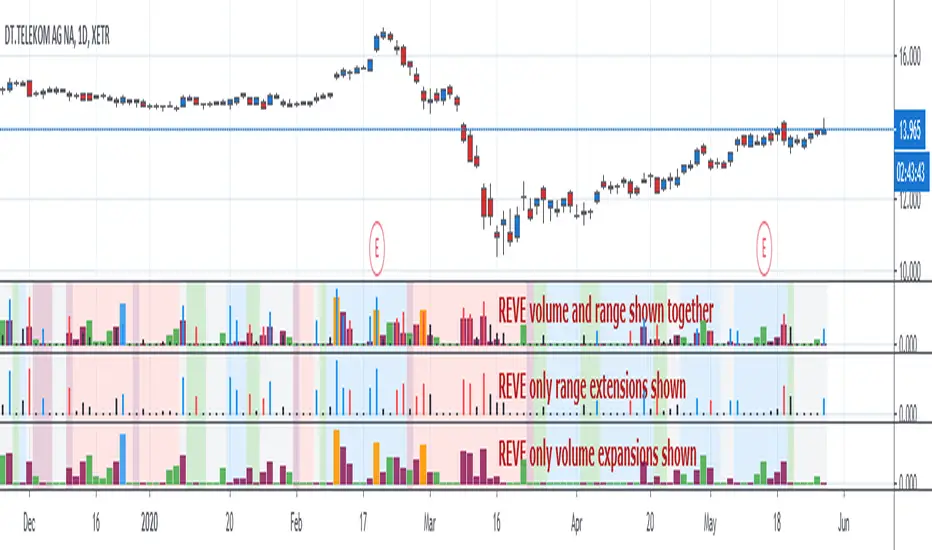 REVE is abbreviation from Range Extension Volume Expansion. This indicator shows these against a background of momentum. The histogram and columns for the range and volume rises ara calculated with the same algorithm as I use in the Volume Range Events indicator, which I published before. Because this algorithm uses the same special function to assess 'normal' levels for volume and range and uses the same calculation for depicting the rises on a scale of zero through 100, it becomes possible to compare volume and range rises in the same chart panel and come to meaningful conclusions. Different from VolumeRangeEvents is that I don't attempt to show direction of the bars and columns by actually pointing up or down. However I did color the bars for range events according to direction if Close jumps more than 20 percent of ATR up or down either blue or red. If the wider range leads to nothing, i.e. a smaller jump than 20 percent, the color is black. You can teak this in the inputs. The volume colums ar colored according to two criteria, resulting in four colors (orange, blue, maroon, green). The first criterium is whether the expansion is climactic (orange, blue) or moderate (maroon, green). I assume that climactic (i.e. more than twice as much) volume marks the beginning or end of a trend. The second criterium looks at the range event that goes together with the volume event. If lots of volume lead to little change in range (blue, green), I assume that this volume originates from institutional traders who are accumulating or distributing. If wild price jumps occur with comparatively little volume (orange, maroon, or even no volume event) I assume that opportunistic are active, some times attributing to more volume.