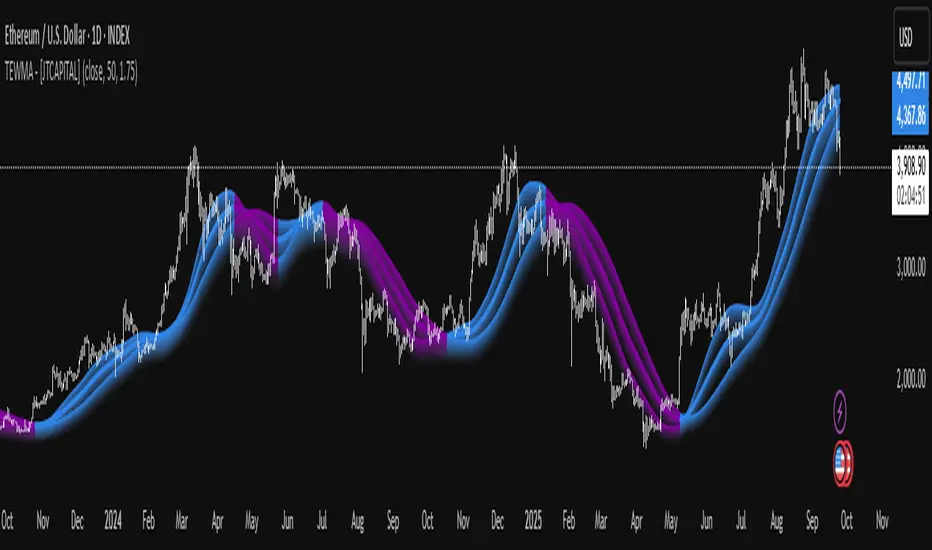 -The main TEWMA is plotted with bold coloring (Blue for bullish, Purple for bearish).