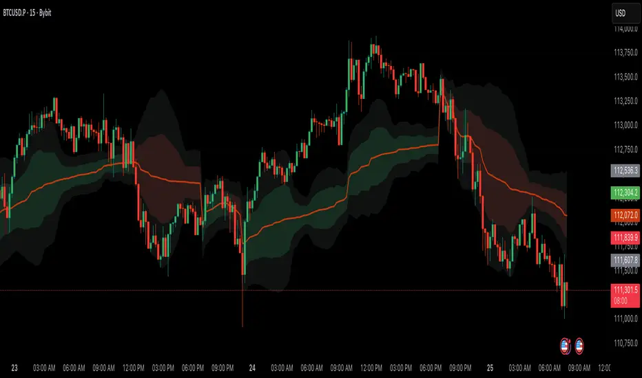 Dynamic Coloring: The cloud adjusts color based on VWAP slope. A rising VWAP is shaded green, suggesting positive momentum, while a falling VWAP is shaded red, suggesting negative momentum. Neutral gray highlights the outer envelope to distinguish extreme zones.
