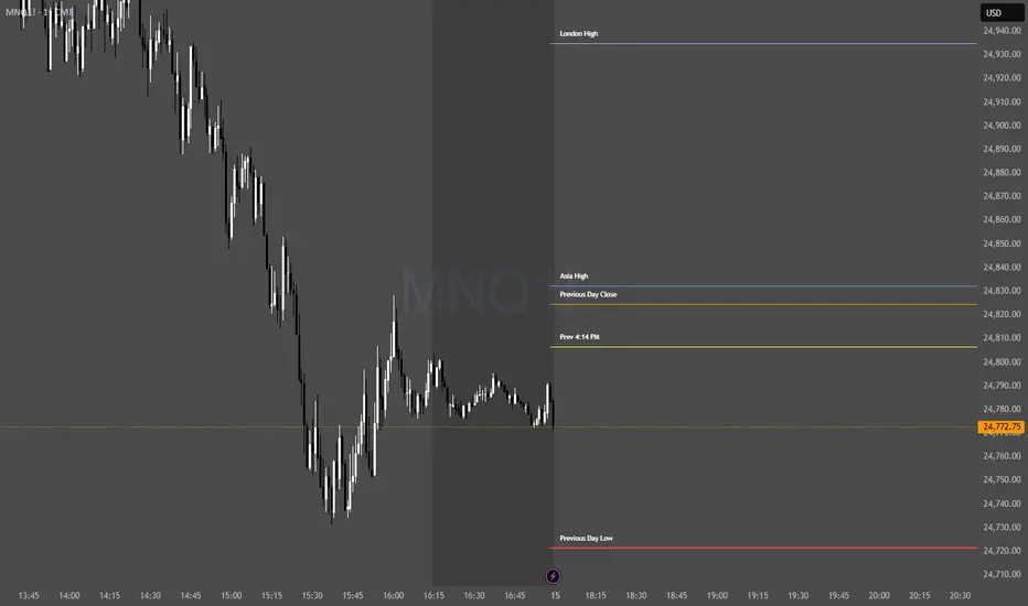 Key Daily Trading session levels specifically for ICT traders, though all are pertinent to any trader who wants to be able to have key session levels on the screen. It comes with the option to chart back to the historic candle or display off of the current candle forward. If you have text set to the right side and it looks like it disappeared, adjust the "Right Edge Screen Push (Bars) under Inputs.