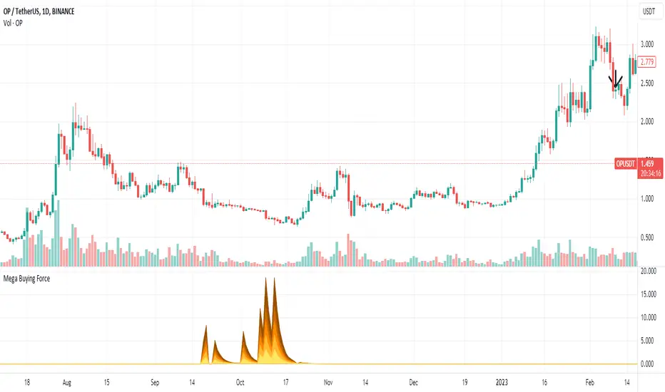 The core of Mega Buying Force is to calculate the position and sentiment of bottom-buying through the rate of price rebound and the distribution of corresponding transaction positions. For example, looking at the 4h level, when the price falls below a new low, if there is a long red candle with a large downward pin-bar, it means that there is a bottom-buying sentiment. If it is subdivided into a 1h level or even a 1m level, you can see in more detail how much trading volume there is at a certain price..