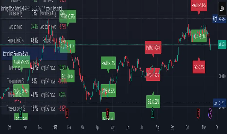 - **Three-run up % / Three-run down %** – Requires premarket, E+1, and E+2 to align, so you can see how often the earnings reaction persists across two full sessions.