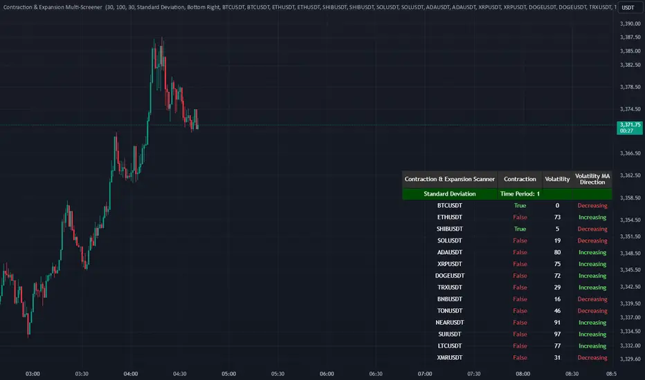 The Contraction & Expansion Multi-Screener analyzes market volatility across many symbols. It provides insights into whether a market is contracting or expanding in volatility. With using a range of statistical models for modeling realized volatility, the script calculates, ranks, and monitors the degree of contraction or expansions in market volatility. The objective is to provide actionable insights into the current market phases by using historical data to model current volatility conditions.