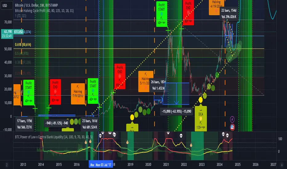 This indicator combines Bitcoin's long-term growth model (Power Law) with global central bank liquidity to help identify potential buy and sell signals.