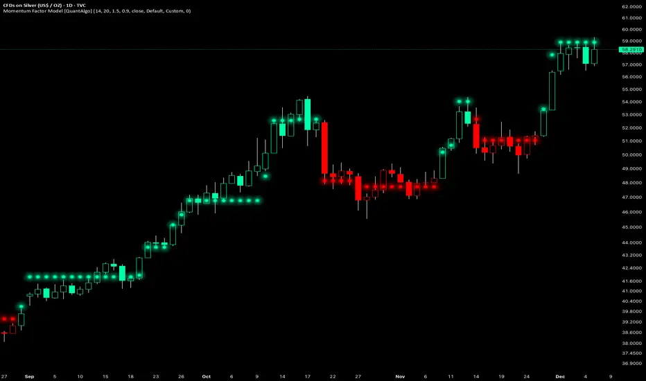 The Momentum Factor Model is a multi-horizon momentum analysis system that combines weighted return calculations with risk-adjusted price projections to identify and track persistent directional trends. The indicator employs a quantitative approach by measuring momentum across multiple timeframes simultaneously, applying exponential decay weighting to balance recent versus historical price action, and constructing volatility-normalized boundaries for trend validation. This factor-based methodology provides traders and investors with a systematic framework for momentum regime identification, trend persistence evaluation, and dynamic support/resistance determination across diverse market conditions and timeframes.