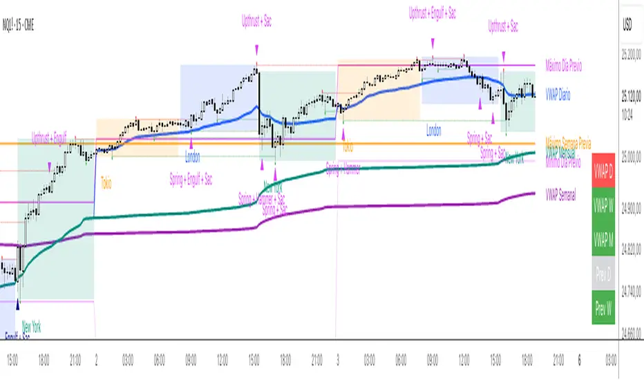 Se trata de una SUITE avanzada que convierte tu gráfico en un sistema operativo: te da un mapa objetivo de liquidez (pivotes), gatillos claros de precio/volumen para entrar/salir y contexto (VWAP, Previos y sesiones) para decidir cuándo sí y cuándo no.