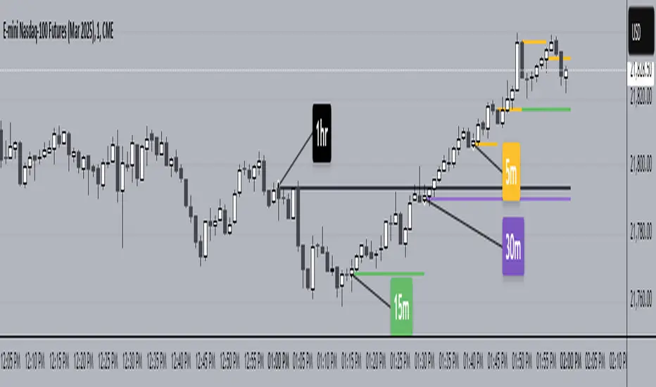 The Multi-Timeframe Open Lines indicator is designed to help traders visualize key price levels at the open of specific time intervals. It draws horizontal lines at the open of 5-minute, 15-minute, 30-minute, and hourly candles, extending these lines to the start of the next respective interval. Traders can now control which timeframes are displayed and how many past opening lines are shown, ensuring a clean and organized chart.