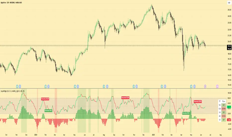 LiquidEdge blends price action with volume pressure using MFI slope and histogram behavior. It doesn’t just show you where price is moving. it shows whether the move is backed by real volume.