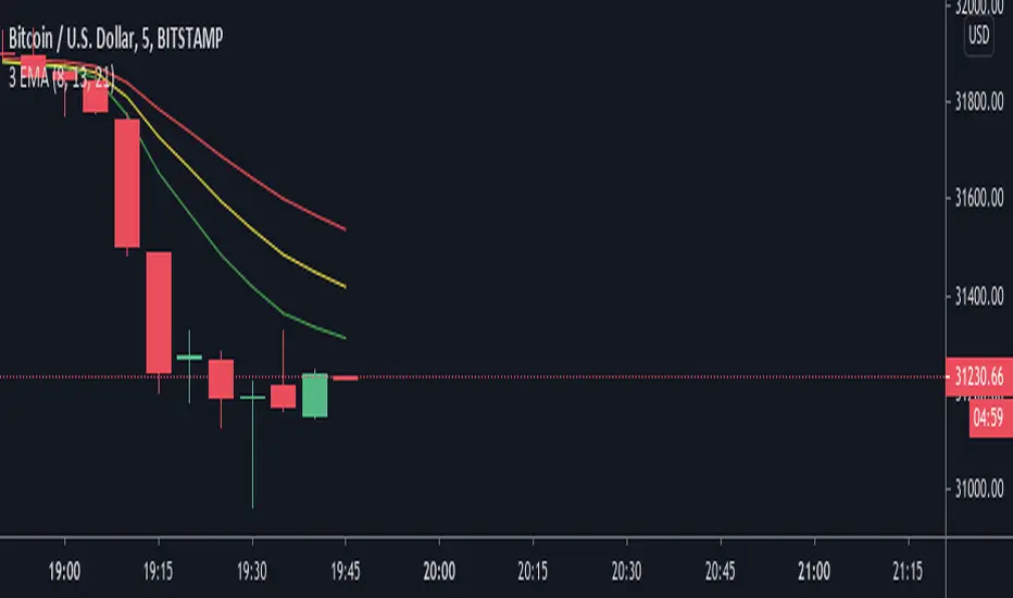 3 EMA's on the same indicator, default are 10, 21, and 55. Plots a solid circle (green or red) to indicate trend direction.