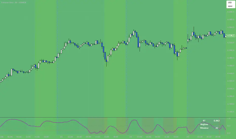 Rolling Trend R² measures the strength of trends using a rolling R² calculation on log prices. Values near 1 indicate a strong, persistent trend, while low values signal choppy or mean-reverting conditions. Includes regime highlighting, reference levels, and an info panel for quick market state identification.