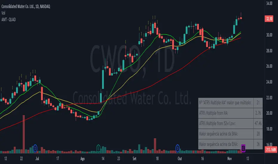 1. "ATR Multiple MA" greater than multiple: shows how many candles the asset stayed 7 times the ATR (average true range) above the 50-period simple moving average (SMA) in the last 126 candles. The purpose is to identify the strength of the asset because the more times it stayed at this distance from the SMA 50, the greater the acceleration of its prices tends to be, indicating a high momentum asset. You can change the period of the SMA in the indicator settings.