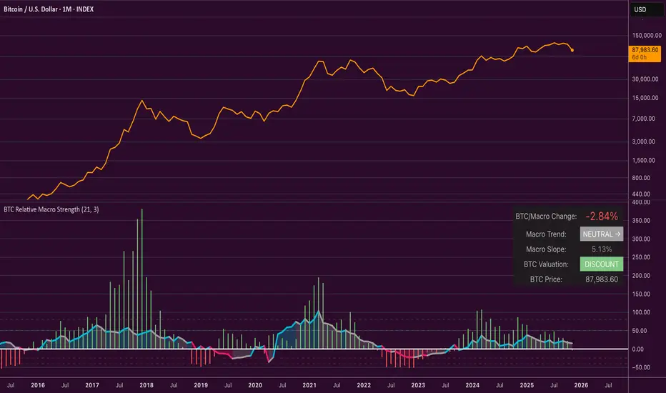 The BTC Relative Macro Strength indicator measures Bitcoin's price strength relative to the global macro environment. By tracking deviations from the macro trend, it identifies potentially overvalued and undervalued market phases.