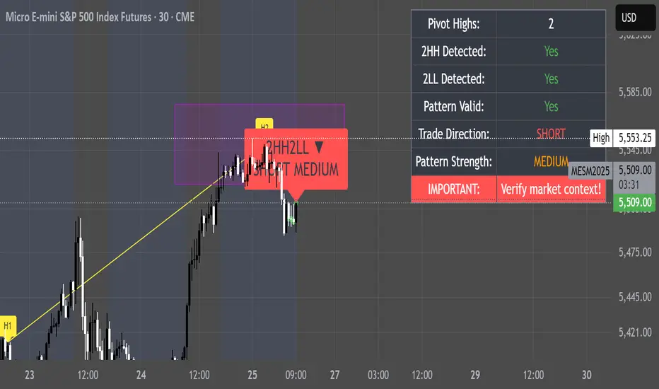 Detects the "Two Higher Highs, Two Lower Lows" (2HH2LL) pattern formation and provides strength analysis with trade signals. The indicator displays visual markers, S/R zones, and clear signals for LONG or SHORT positions.