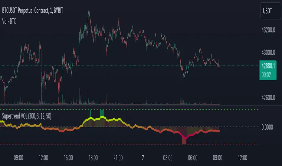 The Supertrend Volume Oscillator is an innovative tool that integrates volume analysis with the established Supertrend indicator to offer a unique perspective on market conditions. By comparing directional volume against the aggregate volume over a designated lookback period, this oscillator adeptly signals overbought and oversold states through a volume-weighted methodology. Key settings such as the lookback period, Supertrend factor, and ATR period are adjustable, allowing traders to tailor the trend detection sensitivity to their preference.