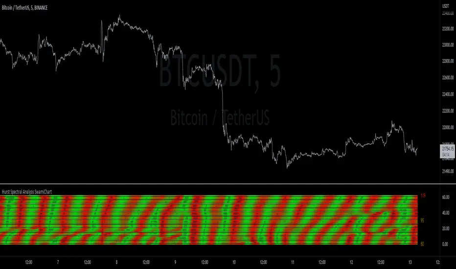 Having a hard time deciding which wavelength to use for a Hurst analysis? Try a handful at once! SwamiCharts by John Ehlers offers a comprehensive way to visualize an indicator used over a range of lookback periods. The Spectral Analysis SwamiChart shows the bullish or bearish state of a spectrum of bandpasses over a user-defined range of wavelengths. The trader simply selects a bandwidth, a base wavelength, and a step/multiple to see the Spectral Analysis SwamiChart. A vertical column of green or red tends to indicate a very bullish or bearish moment in time, meaning that all bandpasses in the analyzed spectrum are in a bullish or bearish orientation simultaneously.
