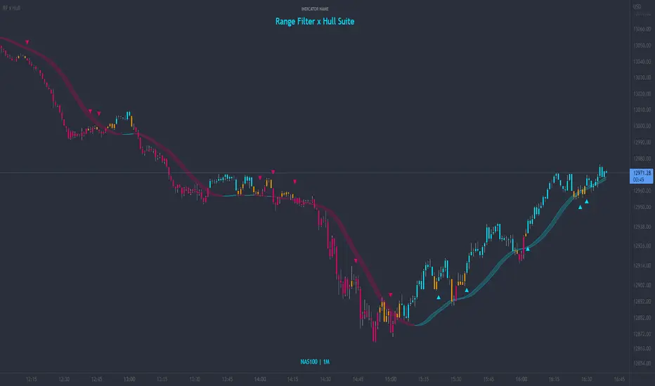 This indicator is a hybrid of two popular indicators, with a twist; namely the Range Filter (Guikroth version) and the Hull Suite (by Insilico).